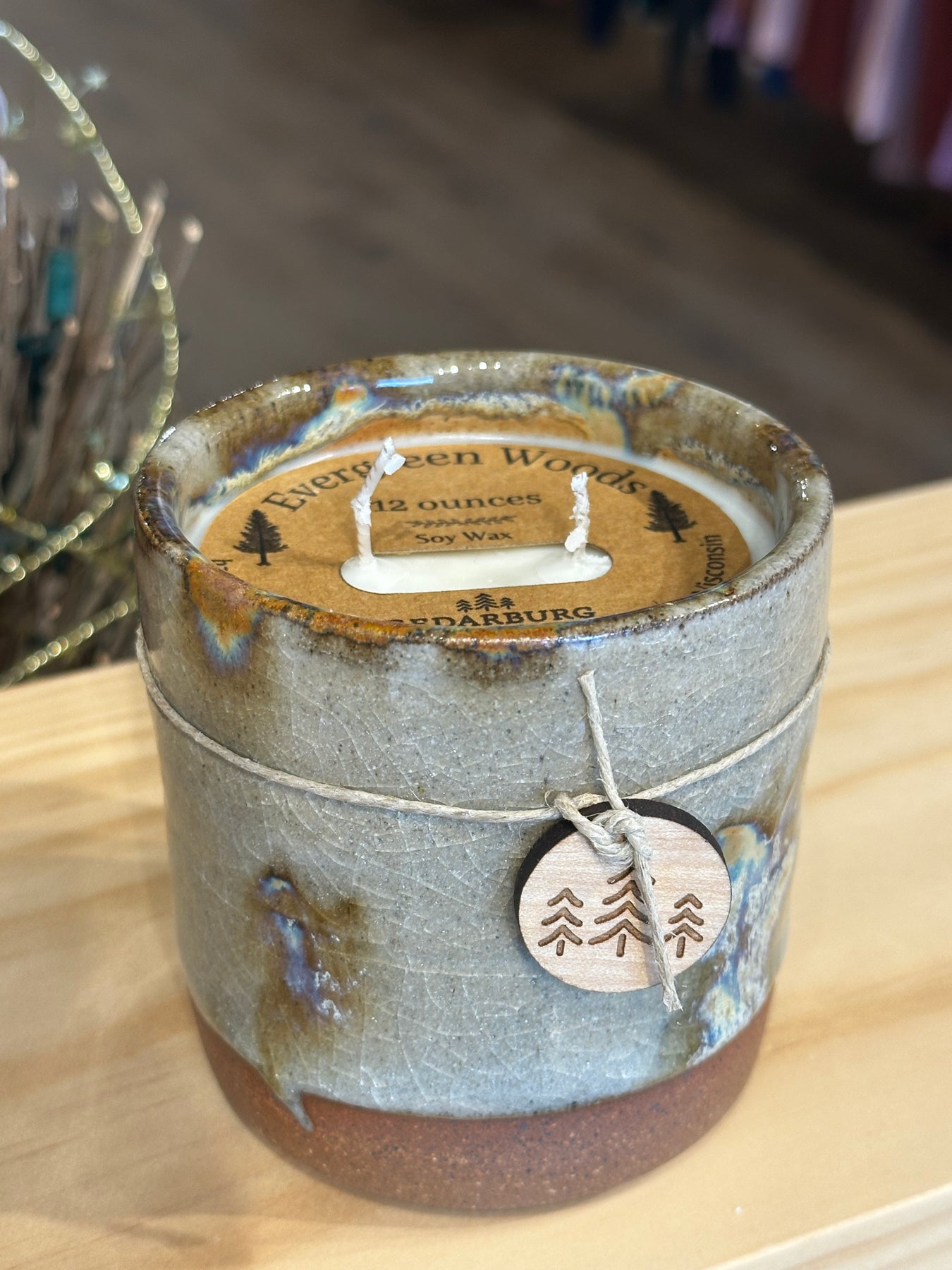Grey 10 ounce ceramic candle with Evergreen Woods soy wax