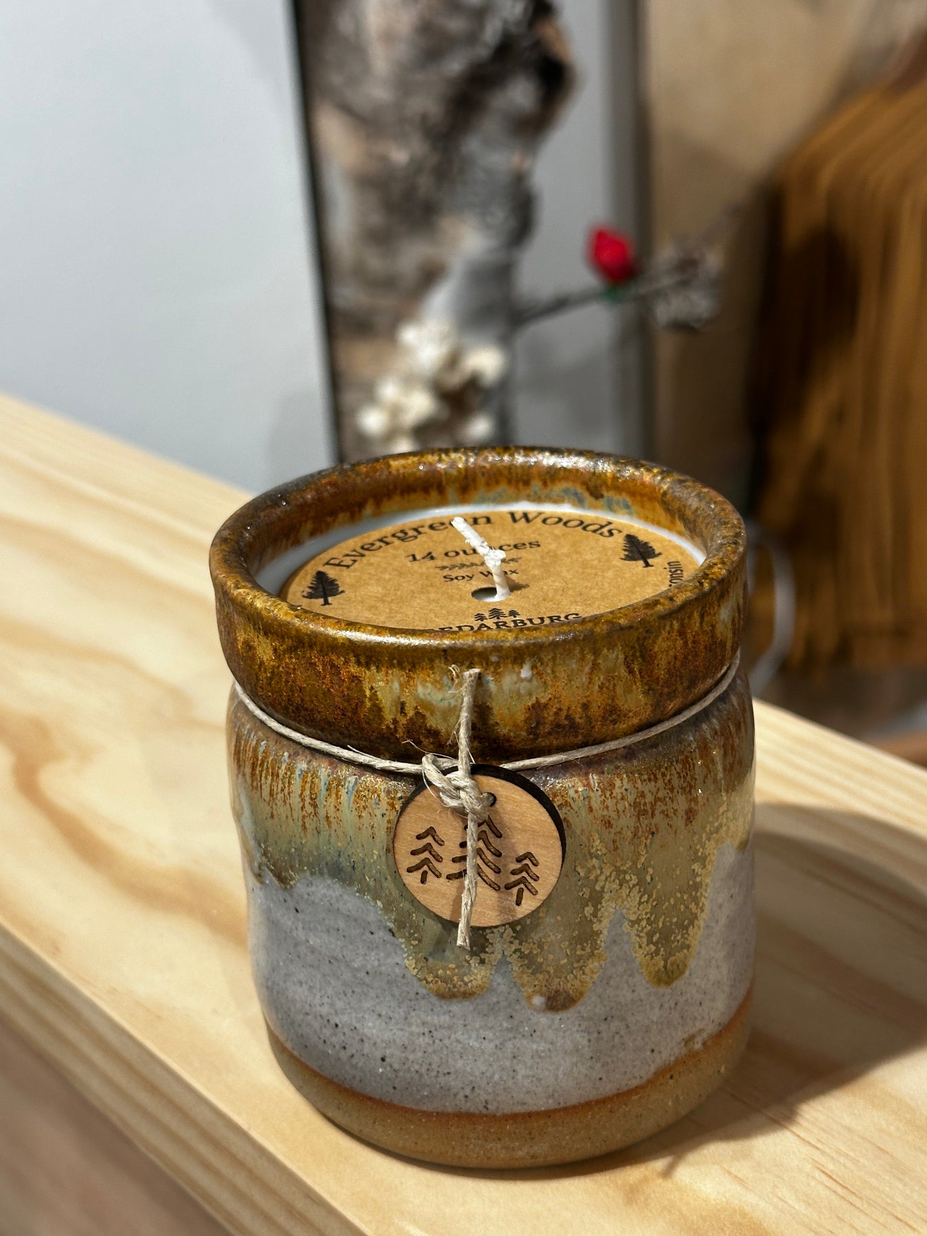 Brown 10 ounce ceramic candle with Evergreen Woods soy wax
