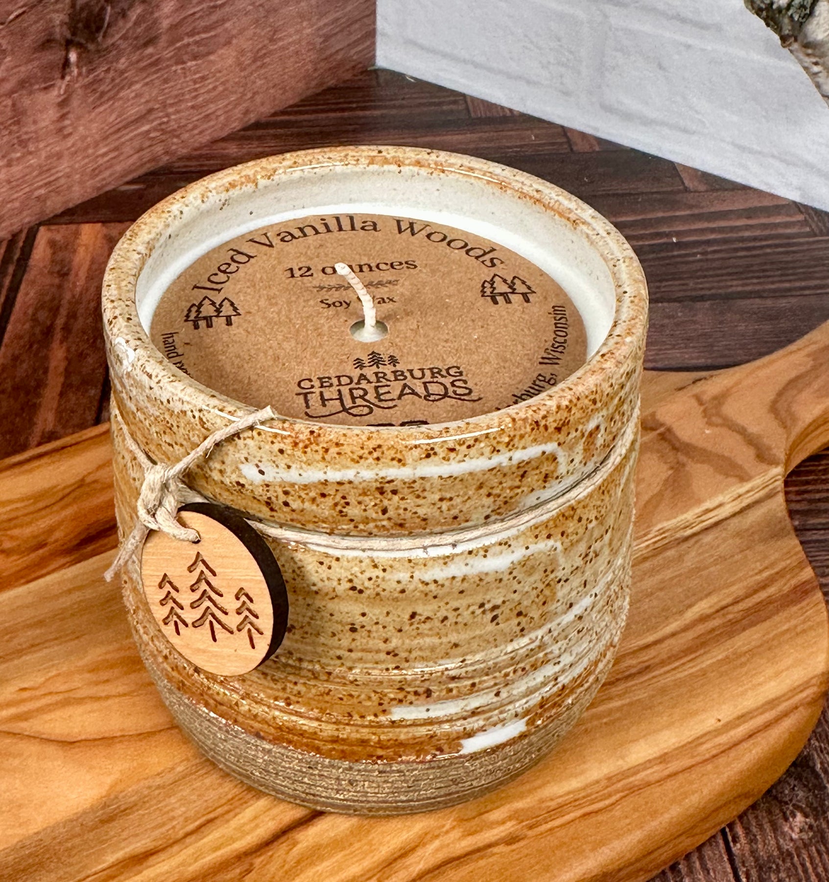 Iced Vanilla Woods hand poured soy candle  in an 10 ounce natural ceramic vessel