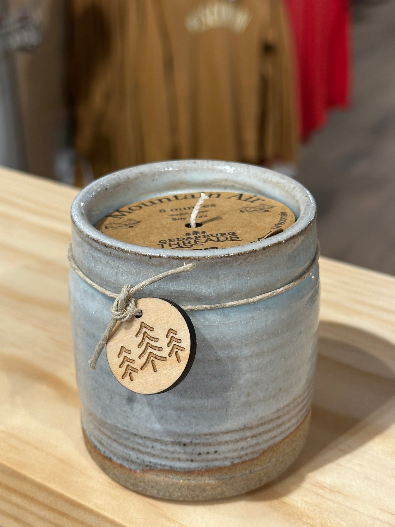 Grey 12 ounce ceramic vessel with mountain air soy candle