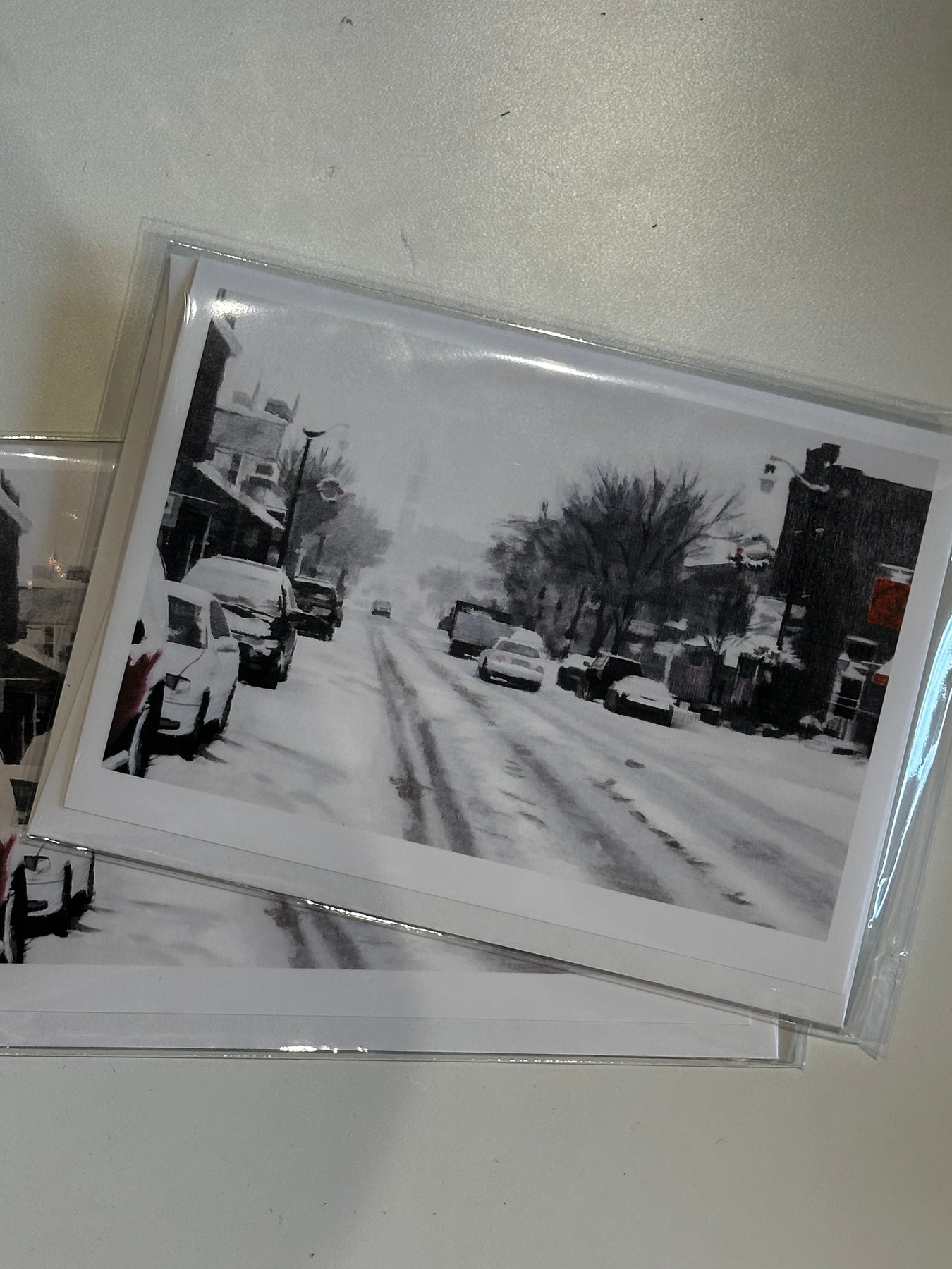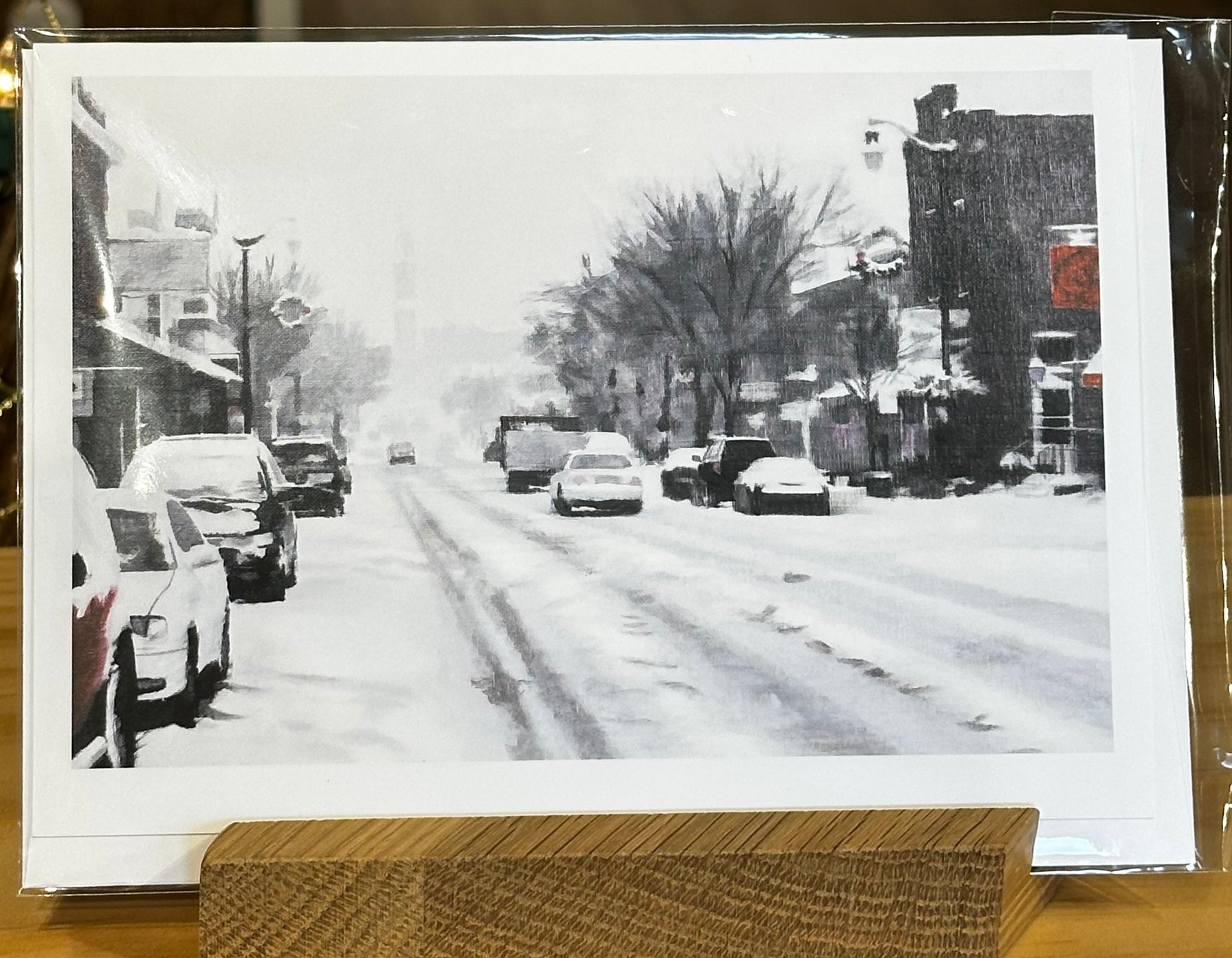These cards are a print of an original oil painting by artist Brian D. Robb.  It depicts a beautiful snowy day in picturesque downtown Cedarburg, Wisconsin.  Perfect for sending to a Cedarburg lover.