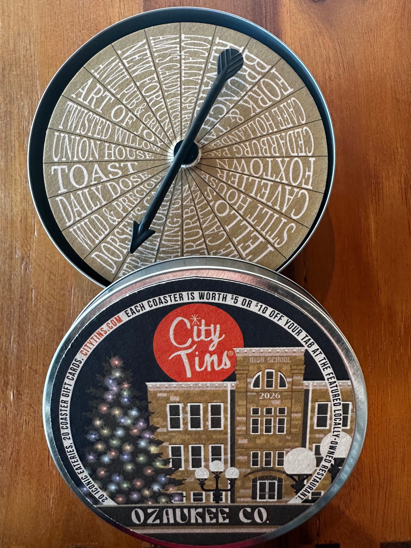 We are a proud supplier of City Tins - Ozaukee County. This is a perfect gift for the person who loves to visit our local bars, restaurants and shops. The fun starts with a spinner that can help you with that, "Where do you want to go tonight?" Plus, you get a nice little discount when you pull out one of these coaster/discounts at the location. The recipient of this tin will have so many fun memories from this gift - maybe they will even take you along. Support local businesses and give a gift that will last all year!