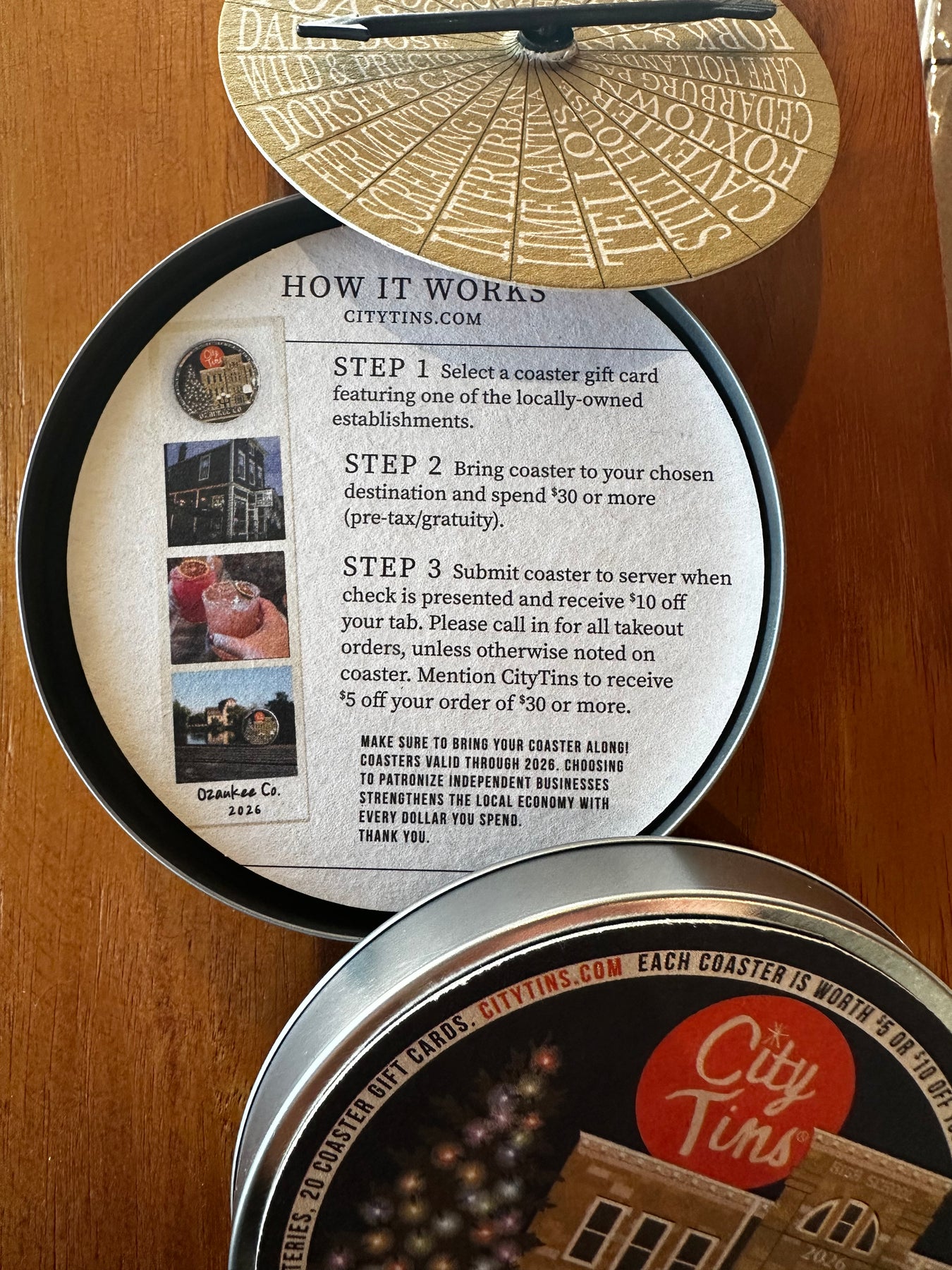 - The fine print...A minimum purchase of $30 is required. May not be applied to tax or gratuity or combined with other offers or Happy Hours. May not be used with third-party delivery services. Redeemable only once and must be relinquished at the time of payment. Limit one coaster gift card per table/order. Valid through 2026. Please be kind and tip your server on a pre-discounted total. CityTins is not liable for coasters unredeemable due to business closings or any other unforeseen circumstance related to the venue.